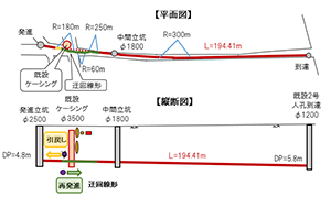推進延長 L=109.71m 曲線種 R=100m 管径 Φ350 土質 シルト質粘土 N値≦5 土被り 6.6〜10.3m 道路幅員 5.0m(住宅地) 現場条件 ・制約条件多い住宅地 ・土被り深く埋設管輻輳 ・流木に遭遇 |